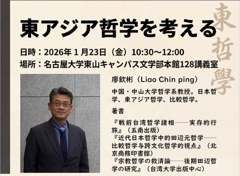 このたび、中国・中山大学哲学系より廖欽彬(Liao Chin-ping)教授をお招きし、以下の通り講演会を開催いたします。 廖先生は、日本哲学、東アジア哲学、比較哲学を専門とされ、『戦前台湾哲学諸相』や田辺元哲学に関する著書など、精力的な研究活動で知 […]